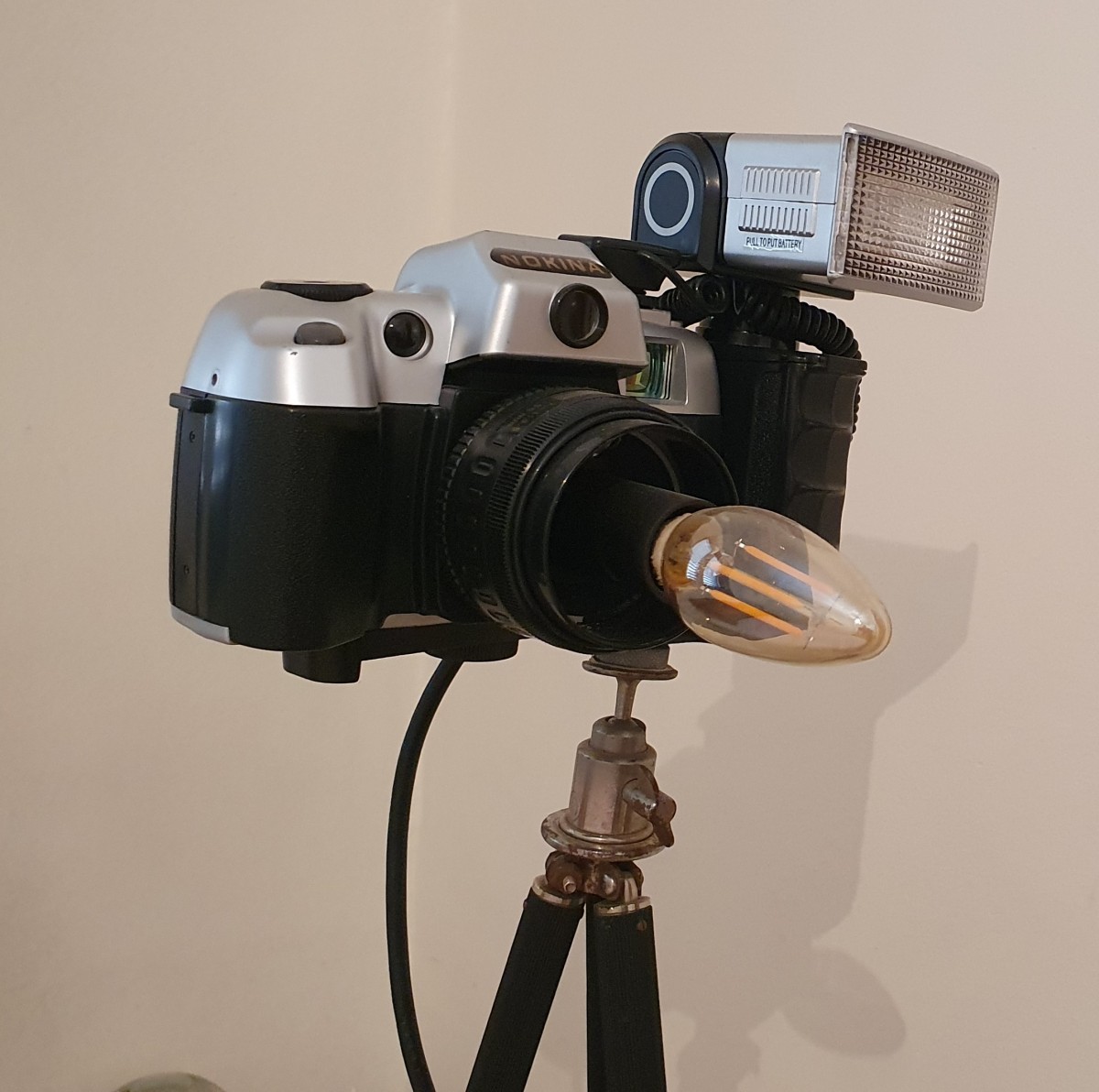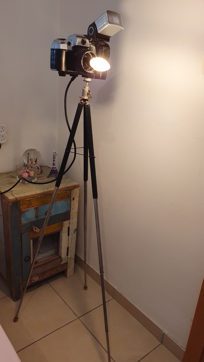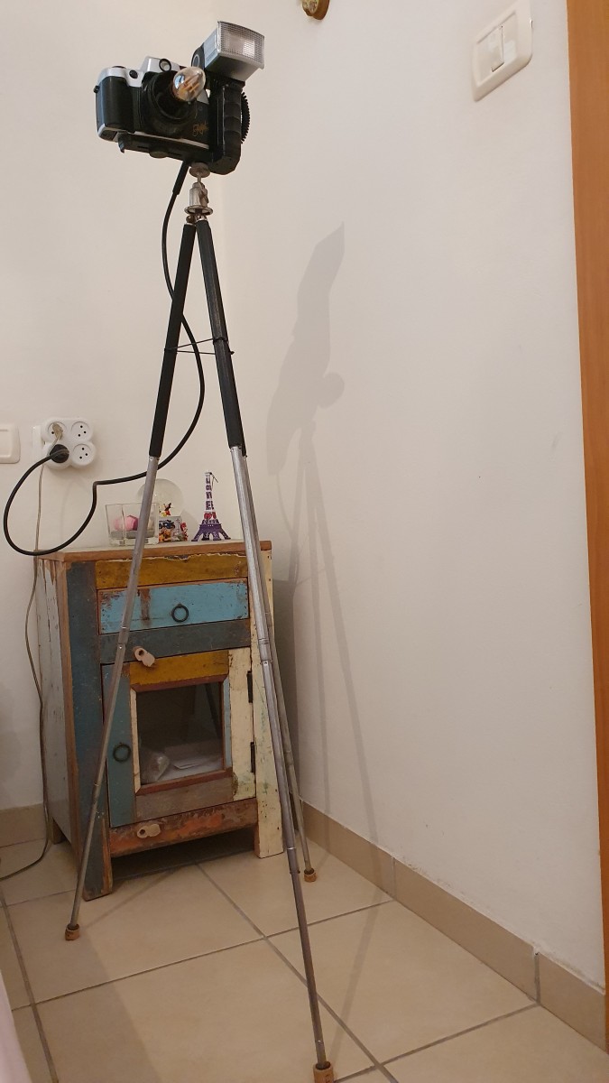 גוף תאורה עשוי מצלמה עומד על חצובת. כל הרכיבים וינטג' מקורה. מיוחדת ויחידה במינה.