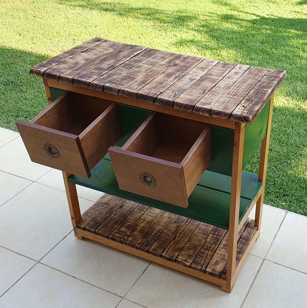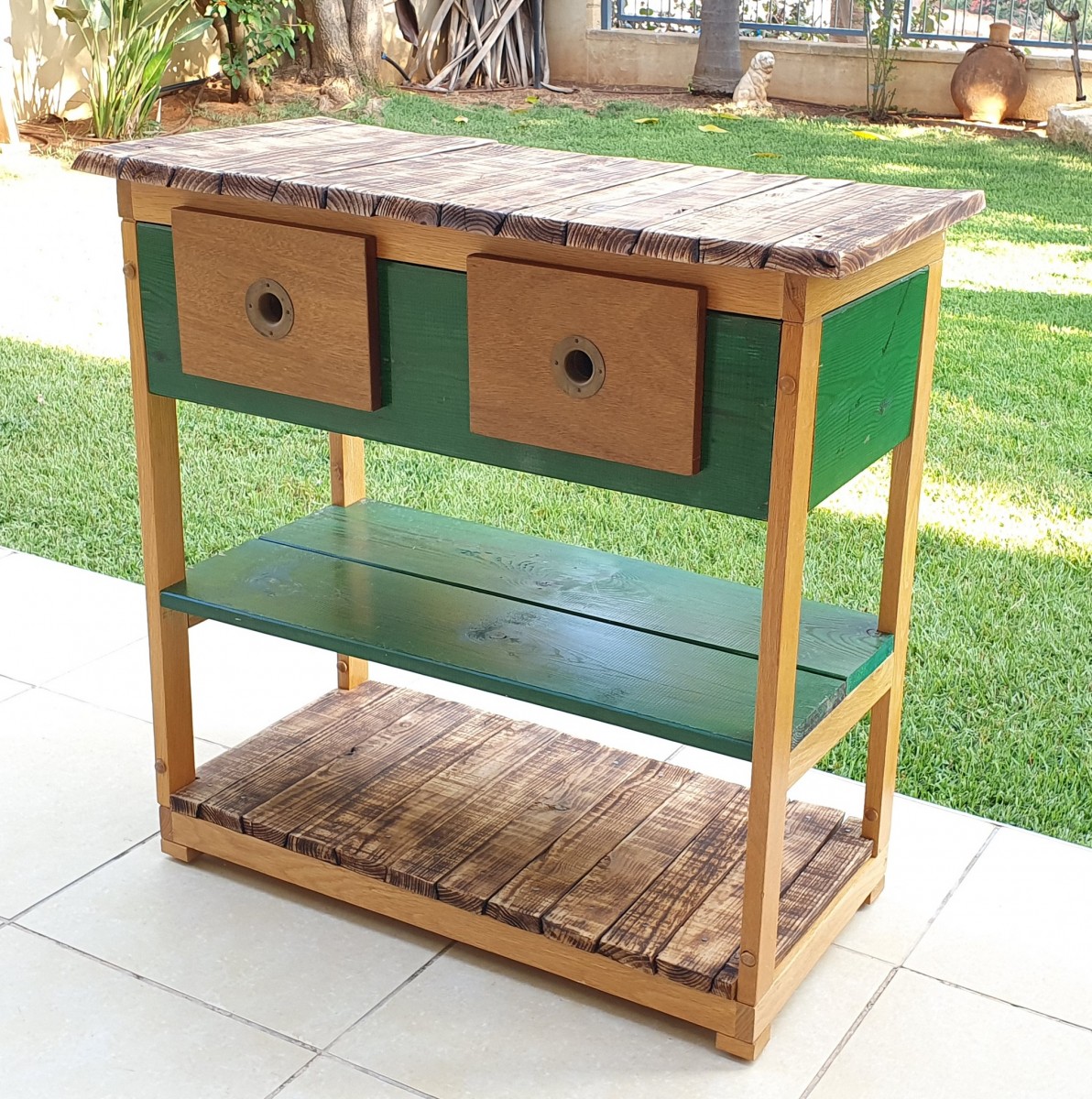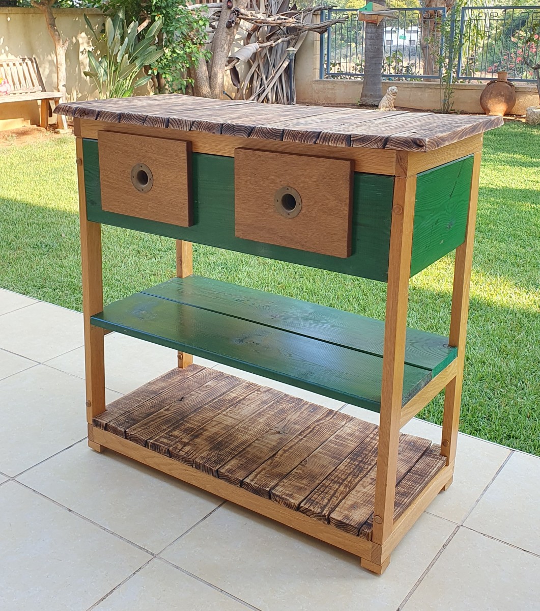 עם שתי מגרות ושני מדפים. גובה: כ-90 ס"מ רוחב: כ-90 ס"מ עומק: כ-40 ס"מ