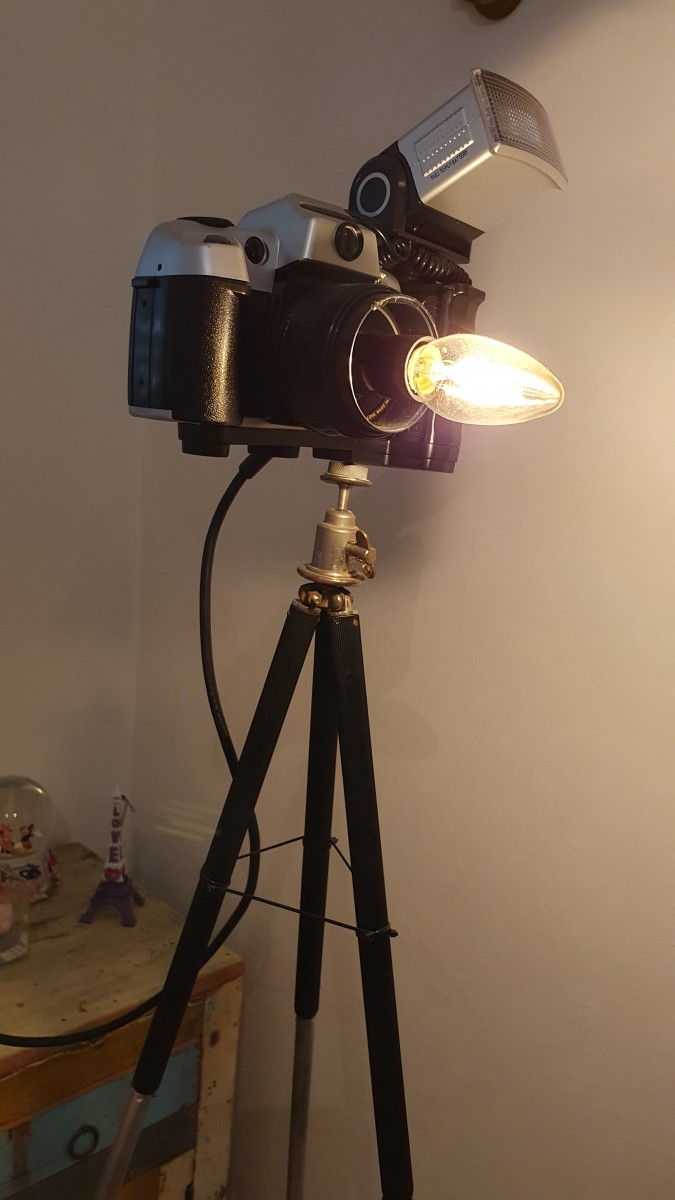 גוף תאורה עשוי מצלמה עומד על חצובת. כל הרכיבים וינטג' מקורה. מיוחדת ויחידה במינה.