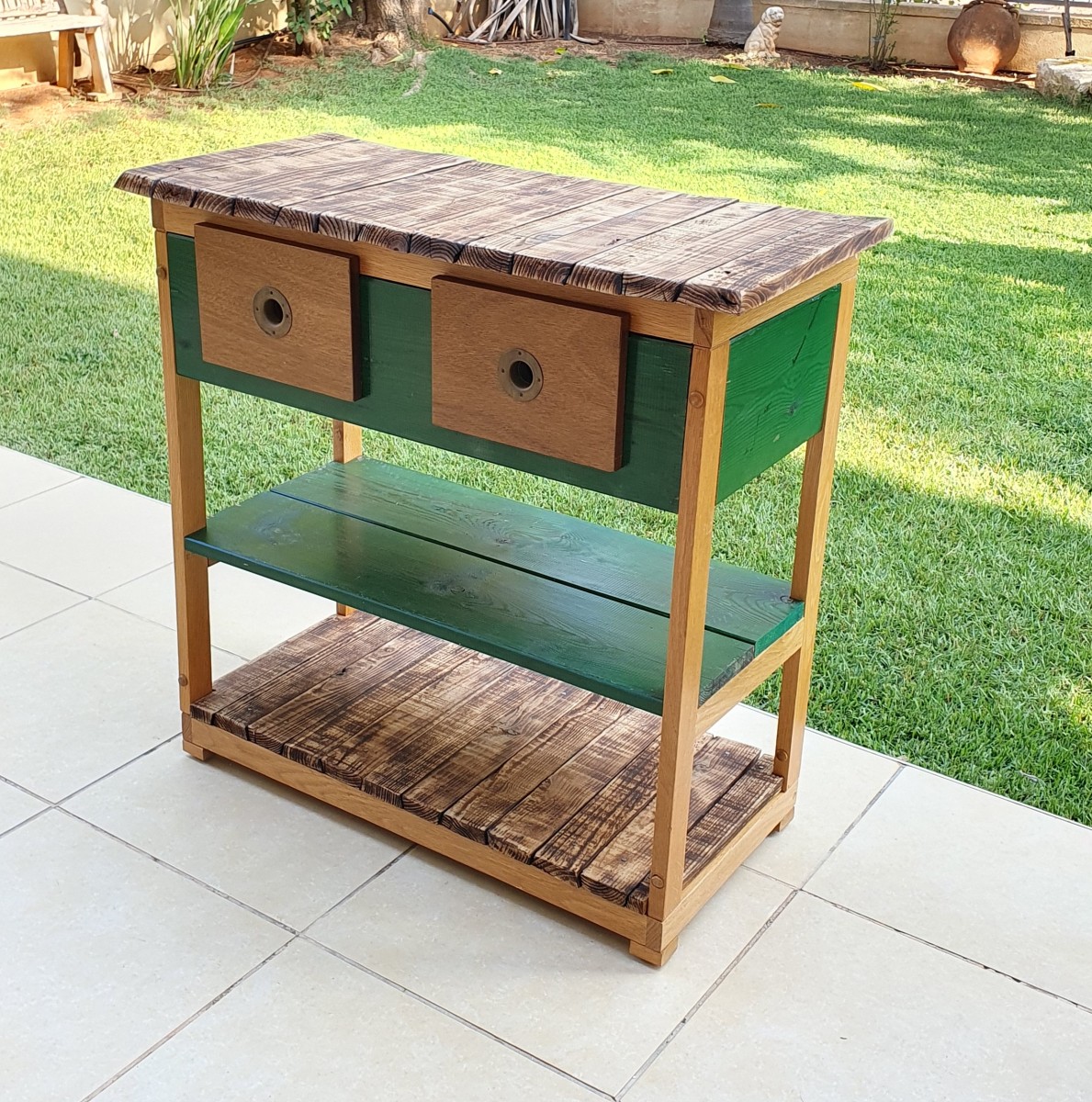 עם שתי מגרות ושני מדפים. גובה: כ-90 ס"מ רוחב: כ-90 ס"מ עומק: כ-40 ס"מ